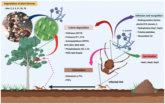 A general overview of the life cycle of the entomopathogenic fungus O. australis (CCMB661), emphasizing all the fungal infection processes in the ant Neoponera curvinodis Forel, 1899. The proteins related to each stage (Adhesion and Recognition), Germination, Cuticle Degradation, and Colonization) are listed.