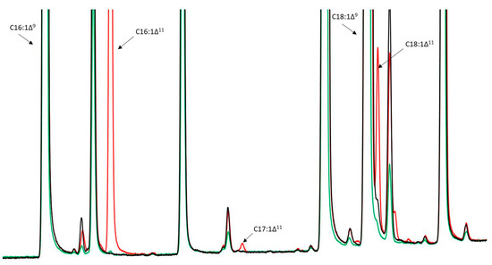 The most abundant fatty acid produced by both desaturases was C16:1Δ11. While JMY6700 (MsexD3) produced trace amounts of C16:1Δ11 only under oleaginous conditions (in MedA+ medium with C/N = 80), JMY6699 (MsexD2) produced C16:1Δ11 (9.6% of total fatty acids; TFA), C17:1Δ11 (trace amount), and C18:1Δ11 (2% of TFA) in both media (Figure 2). These results demonstrate the Δ11-desaturase activity of MsexD2 and MsexD3 in Y. lipolytica. However, the production of FA with two (2UFAs) and three (3UFAs) conjugated double bonds was not detected. Figure 3 illustrates that both C16:1Δ11 and C18:1Δ11 were accumulated in all lipid classes in the cells of JMY6699. Most of the new FAs were found among polar lipids. However, it is common for Y. lipolytica to incorporate a higher level of unsaturated FA than saturated into the polar lipids, which form the membrane structures. The results might suggest that new FAs were not toxic to the cells. Since the number of new metabolites was too low, the engineering of Y. lipolitica strains genetic was required.