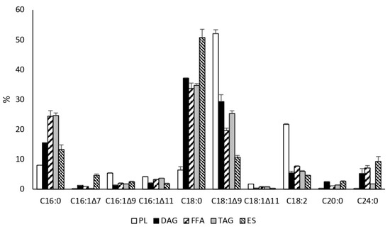 The FA composition of different lipid classes in JMY6699 (pTEF-MsexD2). PL—polar lipids, DAG—diacylglycerols, FFA—free fatty acids, TAG—triglycerides, ES—sterol esters.