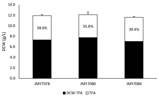 Strains JMY7078, JMY7080, and JMY7084 were cultured in a MedA+ medium with glucose as the carbon source. There were almost no differences in biomass and lipid production among strains. All strains produced around 12 g/L of dry cell weight (DCW), of which 7.5 g/L consisted of lipid-free biomass and 4.5 g/L of lipids (Figure 4). Thus, the lipid content was slightly below 40% of DCW.