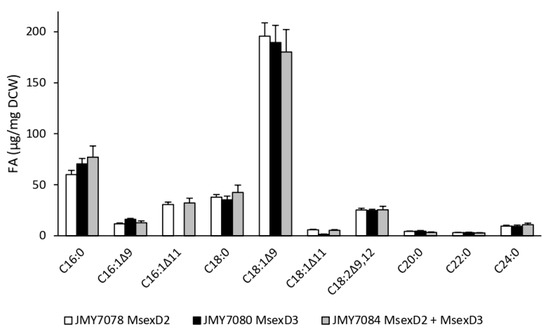 Profiles of the major FAs of the strains JMY7078 (8UAS-pTEF-MsexD2), JMY7080 (8UAS-pTEF-MsexD3), JMY7084 (8UAS-pTEF-MsexD2, 8UAS-pTEF-MsexD3) cultured in MedA+ with glucose as the carbon source. The values provided are an average of the values obtained in three parallel experiments.