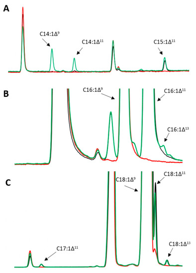GC analysis of M. sexta FAD monounsaturated products, (A) 7 min–9.5 min; (B) 9.2 min–10 min; (C) 10 min–12.5 min. Marked new products: blue—JMY7078 (MsexD2), red—JMY7080 (MsexD3), and green—JMY7084 (MsexD2 + MsexD3). Strains were cultured in MedA+ with glucose as the carbon source.