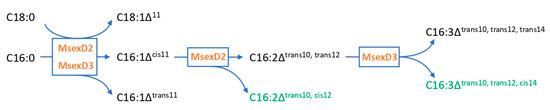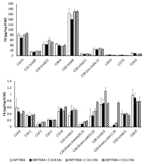 The addition of palmitic acid methyl ester to the medium did not increase the production of C16:1Δ11 (43.91 µg/mg DCW in JMY7084 vs. 43.02 µg/mg DCW in JMY7084 + C16:0-Me) and C16:2Δ10,12 (0.34 µg/mg DCW in JMY7084 vs. 0.35 µg/mg DCW in JMY7084 + C16:0-Me), nor increase C16:0 alone (79.85 µg/mg DCW in JMY7084 vs. 68.17 µg/mg DCW in JMY7084 + C16:0-Me).