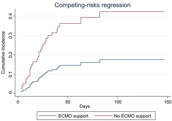 At the survival analysis, patients in the ECMO group had a greater occurrence of candidemia than the patients of the unsupported group (SHR: 2.86, 95% CI: 1.39–5.88) (Figure 1). This finding was confirmed by the multivariable analyses with PS stratification, where patients in need of ECMO support showed higher sub-distribution hazard for candidemia (aSHR: 3.91, 95% CI: 1.73–8.86). As for the adjustment factors, having a higher candida score seemed to increase the hazard for candidemia occurrence (aSHR: 3.04, 95% CI: 2.09–4.42), while vasopressor therapy was negatively associated with the outcome (aSHR: 0.15, 95% CI: 0.05–0.43) (Table 3). The sensitive analysis confirmed a significant effect of ECMO support on the candidemia onset, although it was attenuated (aSHR 2.31, 95% CI: 1.15–4.64) (Table S1).