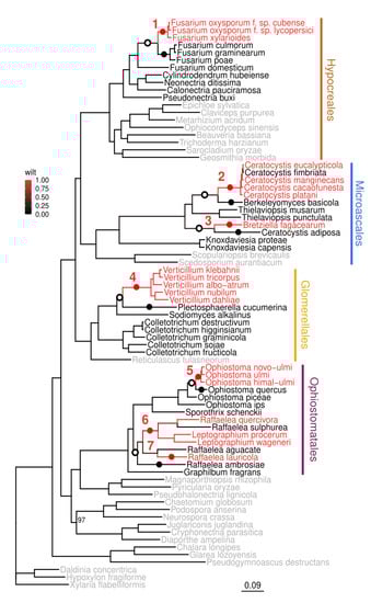 To investigate how many times wilt species have evolved, we calculated the scaled likelihood of causing wilt for each node on the tree. By tracing back the ancestral tree nodes with a likelihood of causing wilt of 0.5 or above, we identified seven independent nodes that were the most recent wilt-causing ancestors of the current wilt-causing species (marked with red dots and numbers in the tree shown in Figure 1). Fusarium wilts (1), Verticillium wilts (4), and Ophiostoma wilts (5) all form monophyletic groups of wilt pathogens. Bretziella fagacearum (3) and Raffaelea lauricola (7) comprise single wilt pathogens, whereas Ceratocystis wilts (2), and Raffaelea/Leptographium (6) form paraphyletic groups of wilt pathogens, with subsequent loss of wilt-causing traits in some species.