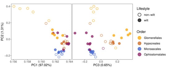 The principal component analysis (PCA) based on the abundance of all gene classes roughly clusters the species belonging to four different orders according to the first three principal components, exposing a phylogenetic signal in the gene composition. Within orders, wilt-causing species are slightly separated from non-wilt-causing pathogenic species, in particular, according to PC2 and PC3. However, this pattern may be partly due to a phylogenetic effect, because in Glomerellales and Hypocreales wilt-causing fungi are monophyletic, whereas, within Ophiostomatales, only one non-wilt-causing species is present in our dataset (Figure 2). PC2 and PC3 place wilt-causing species from Hypocreales and Glomerellales close to each other, and similarly, those from Ophiostomatales and Microascales, but their clusters do not overlap. This indicates a phylogenetic impact on the composition of pathogen-related gene repertoires in wilt and non-wilt-causing fungi.