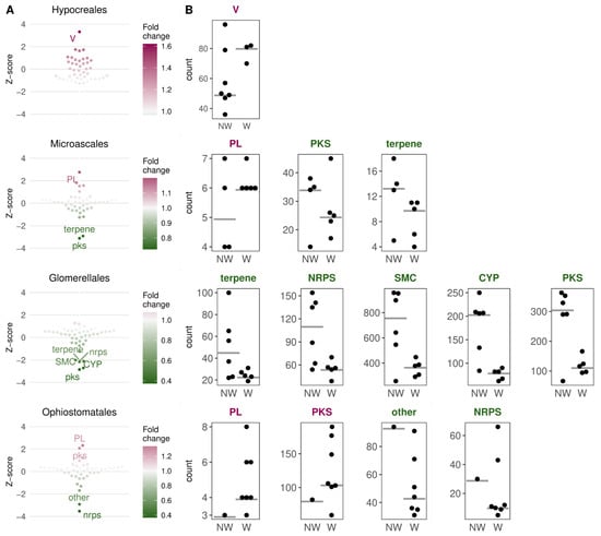 The most and least abundant gene classes in wilt relative to non-wilt-causing pathogenic species in four taxonomic groups of Sordariomycetes. (A) Normalized fold changes (z-scores) or ratios of median gene abundances in wilt vs. non-wilt-causing pathogens in four orders. The color indicates the strength of the fold change in wilt-causing relative to non-wilt-causing species. (B) Distribution of gene counts in gene classes whose medians (grey lines) were most differentiated between wilt- and non-wilt-causing fungi. Dots indicate gene counts of analyzed pathogenic species. NW—non-wilt-causing species, W—wilt-causing species. V—defense mechanisms (KOG function); PL—polysaccharide lyases; PKS—polyketide synthases; NRPS—non-ribosomal peptide synthetases; SMC—secondary metabolite clusters; CYP—cytochrome p450 oxidases; PKS, NRPS, terpene, “other” are all SMC families; PL is a CAZyme (carbohydrate-active enzyme) family.