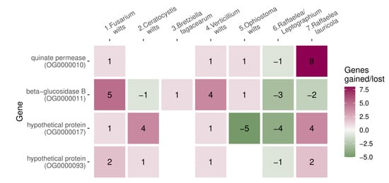 We searched for orthologs in all species (n = 76) and identified gene family expansions and contractions on the phylogenetic tree. We detected gene families that expanded or contracted preferentially in wilt groups, by simulating gene family expansions and contractions on the tree and calculating how likely family abundance can change in 1 up to 7 wilt ancestral nodes simultaneously. The four expanded gene families (orthogroups: OG0000010, OG0000011, OG0000017, and OG0000093) had a significantly higher occupancy across wilt groups than expected from simulations (in 4 out of 7, p = 0.01, Figure 5). Only wilt group 6 (Raffaelea/Leptographium) showed losses instead of gains in all four of those gene families (Figure 5). Only one gene family contraction (OG0000015, hypothetical protein) was enriched in wilt groups (in 4 out of 7, p = 0.016) and there were no gene family expansions or contractions unique to wilt-causing species.