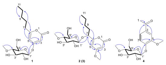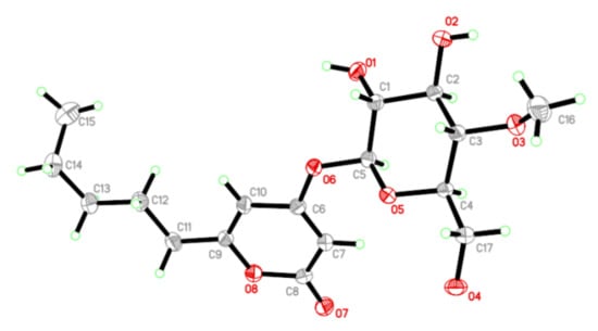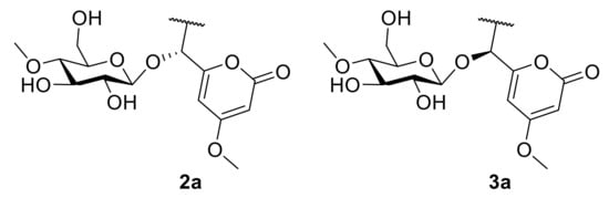 | 6′ | 3.83 (dd, J = 12.2, 2.2 Hz, 1H); 3.69 (dd, J = 12.2, 4.6 Hz, 1H) | 61.7 | 3.68 (dd, J = 11.9, 2.1 Hz, 1H); 3.59 (dd, J = 11.9, 4.5 Hz, 1H) | 62.2 | 3.67 (dd, J = 11.9, 5.2 Hz, 1H); 3.83 (dd, J = 11.9, 2.1 Hz, 1H) | 62.3 |