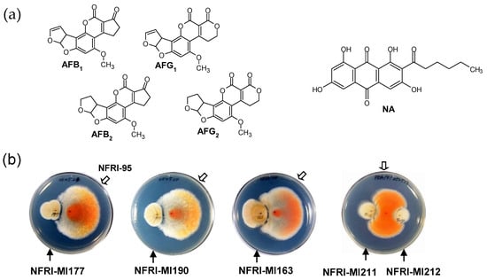 Inhibition of A. parasiticus strain NFRI-95’s accumulation of norsolorinic acid (NA) by isolated fungi: (a) Structures of the major AFs (AFB1, AFB2, AFG1, and AFG2) and NA, which has a bright red color; (b) the inhibition of strain NFRI-95’s NA production by isolated fungi. Spores of the isolated fungus (solid arrows) and spores of NFRI-95 (open arrows) were inoculated and cultured on the same plate. The accumulation of the red pigment (NA) of the NFRI-95 colony was examined from the underside of each plate. Fungi named NFRI-MI177, -MI190, and -MI163, but not NFRI-MI211 or -MI212, showed inhibitory effects on the production of NA by strain NFRI-95.