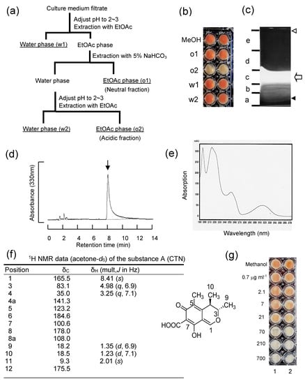 The purification of substance A from P. citrinum NFRI-MI190 culture medium: (a) The filtrate of the culture medium was fractionated at various conditions by organic solvent; (b) the inhibitory activity of each fraction (o1, o2, w1, and w2) was examined in a microtiter plate assay, showing that the inhibitory substance(s) was present in the o2 fraction; (c) the o2 fraction was analyzed by TLC. The inhibitory activity was observed at the c part, which showed bright yellow fluorescence (open arrow) (origin of the spot (closed triangle), front of the developing solution (open triangle)); liquid chromatography result (d) and the absorption spectrum (e) of the extract of the c part by the LC-APPI-MS analysis are shown; (f) the 1H NMR data (acetone-d6) and the structure of substance A; (g) microtiter plate assay using various concentrations of the purified substance A (lane 1) or the authentic standard of CTN (lane 2).