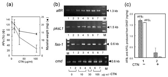 When A. parasiticus SYS-4 was incubated with various concentrations of CTN, aflatoxin production was remarkably inhibited at a CTN concentration of 30 μg mL−1 or more (Figure 3a). The inhibition of aflatoxin production was more remarkable than the inhibition of the growth of SYS-4. To investigate the mechanism underlying CTN’s inhibition of the production of AFs, RT-PCR was used to evaluate the effect of CTN on the expression of three types of aflatoxin genes (aflR, pksL1, and fas-1) and a housekeeping cmd gene (Figure 3b). The expressions of these genes were not affected even at a CTN concentration of 30 μg mL−1 or more. Since the pksL1 and fas-1 genes are involved in the production of NA in aflatoxin biosynthesis [], these results indicated that the inhibition of NA production by CTN was not caused by inhibition of these gene expressions. In addition, since the aflR gene is a positive regulator of all enzyme genes involved in aflatoxin biosynthesis [], these results indicated that CTN may have inhibited a certain post-transcriptional step in aflatoxin biosynthesis.
