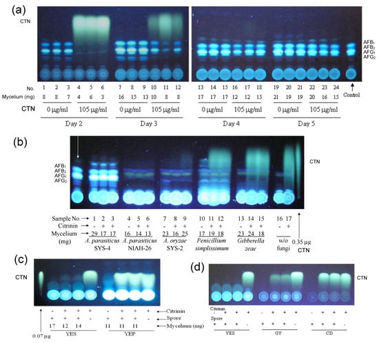 Disappearance of CTN fluorescence after incubation with various media: (a) A. parasiticus SYS-4 was cultured with 105 μg mL−1 of CTN in YES medium for 2–5 days, and the resulting culture media were analyzed by TLC, experiments were done in triplicate, developing solution 1 was used; (b) various species of fungi were cultured with CTN as in panel (a); (c) after A. parasiticus NIAH-26 was cultured with CTN in YES or YEP medium for 3 days by the tip culture method, the resulting medium was analyzed by TLC, mycelia weights are shown, developing solution 2 was used; (d) the same experiment as in panel (c) was done using YES, GY, or CD medium supplemented with CTN.