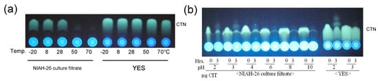 The disappearance of CTN fluorescence by filter-sterilized culture medium: (a) The culture medium of NIAH-26 was sterilized by filter filtration, the resulting culture filtrate was incubated with CTN at various temperatures for 3 h, and the resulting medium was analyzed by TLC; (b) the sterilized medium filtrate of NIAH-26 or YES medium was adjusted to various pH values, and then added with 105 μg mL−1 CTN, and then incubated at 50 °C for 3 h, and the resulting media were analyzed by TLC using developing solution 2.
