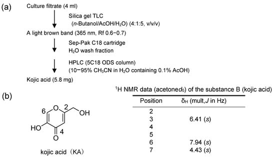 Purification of substance B was performed from the culture filtrate of NIAH-26 using successive chromatographies: TLC twice, Sep-Pak C18 column chromatography, and HPLC (Figure 6a). As a result, 5.8 mg of substance B was obtained from 4 mL of the culture filtrate of NIAH-26. The EI-MS and 1H-NMR analyses showed that substance B was KA (Figure 6b).