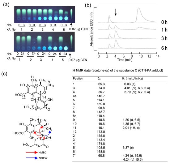 The formation of the CTN-KA adduct and the confirmation of its structure: (a) CTN fluorescence decrease by KA. CTN (1.6 × 10−2 mmol) was incubated with various concentrations of KA (lane 1, no KA; lane 2, 1.6 × 10−2 mmol KA; lane 3, 1.6 × 10−1 mmol KA; lane 4, 1.6 mmol KA; lane 5, the purified substance from NIAH-26 in 42 mL of 48 mM potassium phosphate buffer (pH 7.5) at 50 °C for 3 h (upper TLC plate) or 24 h (lower). The resulting solutions (15 mL each) were analyzed by TLC using developing solution 2; (b) the time course of the detection of the reaction product (arrow). Reaction mixtures containing 2 mM CTN and 75 mM KA were incubated at 50 °C for the indicated periods and analyzed by HPLC using an ODS column and the solvent acetonitrile/water/TFA (450:550:0.5, v/v/v) and monitoring at 330 nm; (c) the structure of the novel substance produced from CTN and KA was determined by NMR. Correlations obtained by heteronuclear multiple bond correlation (HMBC) and nuclear Overhauser effect spectroscopy (NOESY) in substance C are shown.