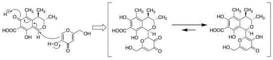 Based on the 13C NMR (Figure S3), heteronuclear multiple-quantum correlation (HMQC, Figure S5), and -bond correlation (HMBC, Figure S6) data for substance C, the signals assignable to C-1 (δC 165.5), C-6 (δC 184.6), and C-8 (δC 178.0) in CTN shifted to δC 65.3, δC 159.0, and δC 148.7 in substance C, respectively. The HMBC analysis also revealed a correlation from the hydrogen at C-1 of the CTN portion to C-6 and C-5 of the KA portion. These facts and other COSY (Correlation Spectroscopy), HMQC, and HMBC correlations clarify the structure of substance C in which CTN is bonded to KA through C-1 of CTN and C-6 of KA. The C-1 sp2 carbon of CTN changes into sp3 carbon; the left ring containing a keto group of CTN is aromatized, and the keto group at the C-6 changes into a phenolic hydroxyl group. Thus, substance C was identified as 3,4-dihydro-6,8-dihydroxy-1-(3-hydroxy-6-(hydroxymethyl)-4-oxo-4H-pyran-2-yl)-3,4,5-trimethyl-1H-isochromene-7-carboxylic acid. The NOESY examination (Figure S7) detected a correlation between the hydrogen at C-1 and the hydrogens of C-9 methyl, indicating that the hydrogen at C-1 and the C-9 methyl have the same orientation with respect to the ring. Since the absolute configuration of C-3 and C-4 of CTN was determined, the stereochemistry of substance C was determined to be 1R, 3S, 4R (Figure 7c). These results demonstrated that the substance was (1R,3S,4R)-3,4-dihydro-6,8-dihydroxy-1-(3-hydroxy-6-(hydroxymethyl)-4-oxo-4H-pyran-2-yl)-3,4,5-trimethyl-1H-isochromene-7-carboxylic acid, which was herein named the ”CTN-KA adduct”.