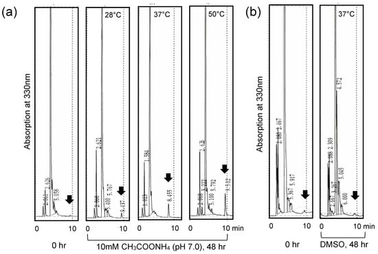 Stability of the CTN-KA adduct: (a) CTN-KA adduct was incubated in 10 mM ammonium acetate buffer (pH 7.0) at 28 °C, 37 °C, or 50 °C for 48 h. The resulting metabolites were analyzed by HPLC using ODS columns and the solvent acetonitrile/water/TFA (450:550:0.5, v/v/v) at 1 mL min−1. The peaks of CTN (black thick arrows) increased with the temperature in this aqueous solution; (b) CTN-KA adduct was incubated in DMSO at 37 °C for 48 h, CTN did not increase, suggesting that the CTN-KA adduct was stable in DMSO.