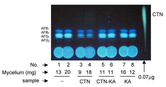 The tip culture method was used for the detection of fungal metabolites and for the measurement of the fungal growth []. A 1 mL Pipetman tip (Gilson, Middleton, WI, USA) was used as a culture vessel for the liquid stationary culture. First, 5 μL of spore suspension of each fungus was inoculated into 200 μL or 250 μL of liquid medium supplemented without or with CTN. After 4 days of incubation at 28 °C, the mycelium and culture medium were separated by centrifugation. For the detection of AFs, 10 μL of the medium was spotted onto a thin-layer chromatography (TLC) silica gel plate (silica gel 60 5721, Merck & Co., Whitehouse Station, NJ, USA), and then dried. The resulting plate was developed with either developing solution 1 (chloroform/ethyl acetate/90% formic acid (6:3:1, v/v/v)) or developing solution 2 (hexane/ethyl acetate/acetic acid (50:50:1, v/v/v)). The presence of AFs and CTN was evaluated under long-wavelength UV light (365 nm). For the detection of KA, the TLC plate was sprayed with 1% FeCl3 in 0.1 M HCl solution [].