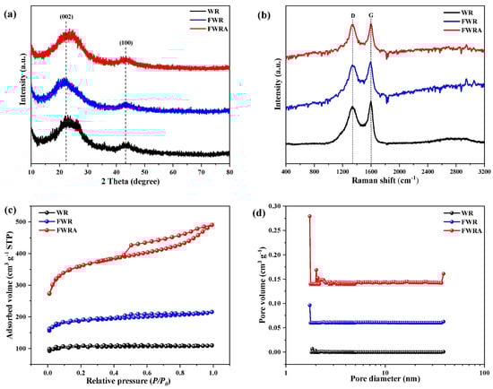 X-ray diffraction and Raman spectroscopy were used to analyze phase structure, confirming that WR, FWR and FWRA are mainly carbon materials. In Figure 2a, the diffraction peak at 2θ = 23° is attributed to the (002) planes of graphitic stacking and the peak at 2θ = 43° ascribed to (100) crystal plane, revealing disordered characteristics of the three materials [35]. Furthermore, in the Raman spectra of WR, FWR and FWRA (Figure 2b), there are two obvious feature peaks at around 1340 cm−1 (D-band) and 1580 cm−1 (G-band), which are caused by structural defects and graphitic sp2 carbon, respectively, indicating the existence of graphite structures. The IG/ID values for WR, FWR and FWRA are 1.13, 1.02 and 1.01, respectively, suggesting a decreasing order of WR > FWR > FWRA in terms of graphitization level.
