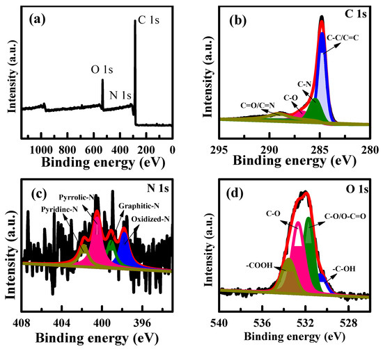 The chemical compositions of the FWRA sample were examined by XPS. The survey spectra show the C1s (285 eV), O1s (533 eV) and N1s (400 eV) signals (Figure 3a). In the C1s spectrum with deconvolution(Figure 3b), the peaks at 284.7, 285.4, 286.7 and 289.1 eV are ascribable to C-C/C=C, C-N, C-O and C=O/C=N species, respectively [36]. The N1s profile can be resolved into four peaks (Figure 3c), the peaks at around 397.8, 399.1, 400.5 and 401.8 eV are assigned to pyridinic N, pyrrolic N, graphitic-N and oxidized-N, respectively. The O 1s spectrum is presented in Figure 3d and shows four distinct peaks at 530.6, 531.7, 532.6 and 533.5 eV, assignable to C-OH, C-O, O-C=O and COOH groups, respectively [37]. These results suggest the existence of abundant N-, and O- functional groups in FWRA.The functional groups provide a large number of defects which leads to the formation of active sites.