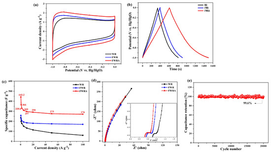 The energy storage performances of WR, FWR and FWRA were examined in 6 M KOH electrolyte employing a three-electrode system. The CV curves of all samples exhibited a quasi-rectangular shape in the potential range of −1.0 to 0 V, showing that the area represents the capacitance of the carbon materials (Figure 4a).
