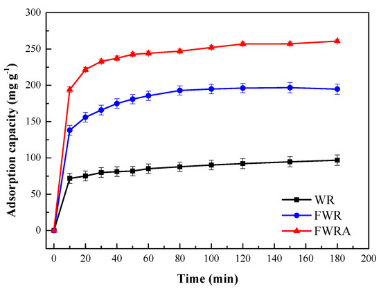 A large number of dye-containing waste waters were discharged from industrial processes without effective treatment. Methyl orange (a kind of azo dye) was selected in the present study to to determine the adsorption capacities of WR, FWR and FWRA in aqueous solution. A designated amount (i.e.,12.5 mg) of adsorbent samples was added to 50 mL of MO solution (50 mg/L) and stirred at 25 °C water bath. During the period of 0–180 min, the mixture was sampled at designated intervals, and the supernatant after centrifugation was analyzed at room temperature by Ultraviolet-visible spectroscopy at 463 nm to determine the concentration of MO in the aqueous phase. The amount of dye adsorbed on the adsorbent (q, mg/g) was calculated using Equation (5):