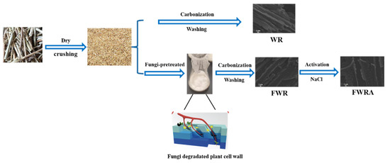 Compared to the porous carbon prepared directly from raw biomass, the porous carbon that was prepared from the biomass pretreated by P. vitreus exhibits higher porosity and larger specific surface area. The phenomenon could be attributed to that the white-rot fungi can degrade plant-cell-wall components and loosen the internal structure of biomass. Therefore, during NaCl activation after the carbonization step, NaCl can have easy access to the internal surface of carbons for full activation [21,41,42]. The SEM results suggest that the FWR materials are much looser in structure than WR, whereas the FWRA material is the most significant in terms of porosity. The results imply that fungal pretreatment plays a key role in the forming of a porous structure. As indicated by the Raman results, FWRA is the lowest in graphitization degree, plausibly due to the high formation of pores. From the textual parameters of Table 1, it is clear that both the fungal pretreatment and NaCl activation steps are critical for the development of porosity in carbon.