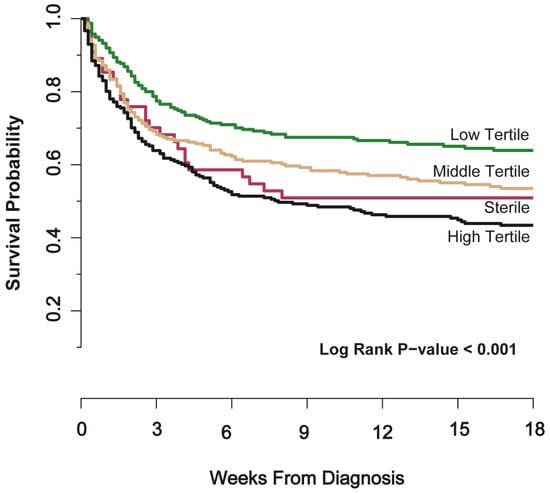 Kaplan–Meier Curve of 18-week Survival by CSF Fungal Burden Tertile in Cryptococcal Meningitis. Figure 1 demonstrates cumulative survival probability by Kaplan–Meier curve with Log Rank testing. At 18 weeks, the high tertile group has the poorest survival with 56% [135/241] dead, followed by the sterile culture group with 47% [26/55] dead, the middle tertile group with 46% [107/234] dead, and the low tertile group with 35% [83/235] dead. Log Rank p-value is calculated across all groups. CSF quantitative culture tertiles: Low Tertile = 1–14,700 CFU/mL; Middle Tertile = 14,701–206,000 CFU/mL; High Tertile > 206,000 CFU/mL.