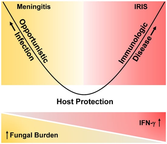 Pirofski and Casadevall proposed the damage-response framework model whereby clinical disease can occur by either uncontrolled pathogen dissemination or a detrimental host immune response, but with the common denominator being host damage (Figure 2) [23,24]. Immune reconstitution inflammatory syndrome (IRIS) is a dysregulated immune response to an opportunistic pathogen upon restoration of a depleted component of the immune system [22]. Excess inflammation in the brain in cryptococcal meningitis IRIS can be fatal [25,26]. In contrast to unmasking disease, paradoxical cryptococcal IRIS occurs subsequent to diagnosis and treatment of infection and after initiating ART. Paradoxical IRIS may present anywhere from a few days to years after ART initiation in cryptococcal meningitis, while the incidence and mortality are variable, with incidence ranging between 8–49% and mortality between 0–36% [22,27,28]. While unmasking cryptococcal disease and paradoxical cryptococcal IRIS occur at different time points in relation to diagnosis, the pathogenesis of the two may be similar.