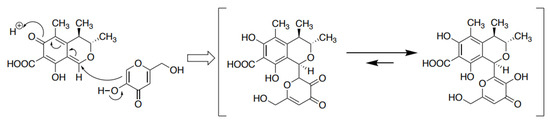 Formation of the citrinin-kojic acid (CTN-KA) adduct. In the presence of KA in an aqueous condition, CTN is non-enzymatically converted to form the CTN-KA adduct [12].