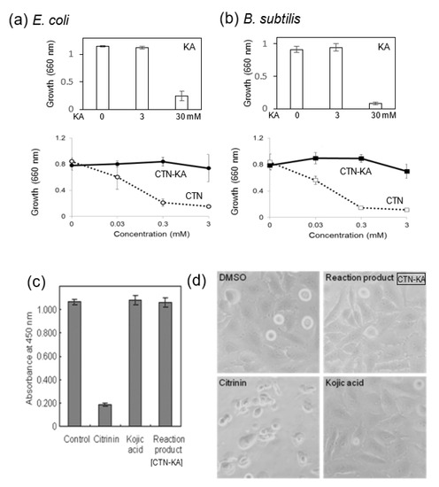 KA has been known to have anti-bacterial and anti-fungal effects on several genera of bacteria including Agrobacterium, Bacillus, Chromobacterium, and Clostridium, yeast and fungi, and more [26], indicating that KA can also exert adverse effects on organisms. However, relatively high concentrations of KA were necessary to obtain such effects; for example, 1.0 mg mL−1 (3 mM) KA inhibited the swarming of Azospirillum and Proteus mirabilis and 50 mM KA (7.1 mg mL−1) completely inhibited S. sclerotiorum symptoms in soybean [26]. Our present findings also demonstrated that a high concentration of KA (30 mM) was necessary to inhibit the growth of the bacteria (Figure 2a,b). In the cases of supplementation, the regulation value of CTN is relatively high (European Food Safety Authority [EFSA] value: 2000 μg/kg). Although our previous work showed that 1–1.3% of the CTN-KA adduct was decomposed to CTN after incubation at either 37 °C or 50 °C for 48 h. in aqueous condition [12], the resulting concentration seems to be very low. The consideration of the effects of KA on the health of animals and humans thus does not seem necessary.