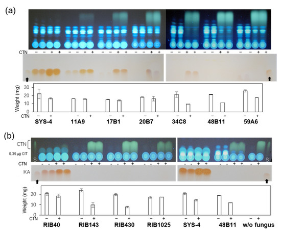 To test this possibility, we investigated whether CTN affects the growth of other fungi, i.e., A. oryzae RIB40 (a wild strain) and three KA-non-producing strains: RIB143, RIB430, and RIB1025 (Figure 3b). We also repeated the experiments using A. parasiticus SYS-4 and 48B11 mutant. Although CTN inhibited the growth of all fungi, the inhibition rates of the KA-non-producing A. oryzae strains other than RIB1025 were higher in the KA-non-producing mutants (~40% of weight in the absence of CTN) compared to the KA-producing wild strains (~93%). The growth rate of A. parasiticus SYS-4 was 69%, and that of the 48B11 mutant was 63%. The same experiments showed that CTN enhanced the KA production of RIB40 as well as SYS-4, whereas other strains did not produce KA irrespective of the addition of CTN, indicating that the absence of KA production caused fungi to be more susceptible to a CTN attack. It was also confirmed that first-added CTN mostly remained even after 4-day incubation, suggesting that CTN could not be consumed with KA.