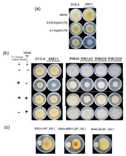 We analyzed the effects of CTN on the fungal growth by using agar media (Figure 4). The KA-non-producing strain 48B11 and wild SYS-4 strain were, respectively inoculated onto GY agar medium supplemented with 0.035 mg mL−1 or 0.1 mg mL−1 CTN and then cultured for 4 days. At both concentrations, the growth of 48B11 was more severely inhibited compared to the growth of SYS-4, suggesting that 48B11 was more susceptible to CTN, probably due to its lack of KA productivity (Figure 4a).