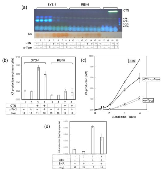 To examine the enhancement of KA production with CTN, we investigated the effect of α-tocopherol, an antioxidant reagent, on the production of KA by using the tip culture method. SYS-4 and RIB-40 strains were incubated with either or both CTN and α-tocopherol for 3 days in tip culture and then analyzed by TLC (Figure 5a). In addition, after the culture medium of the tip culture was mixed with FeCl3/0.1 M HCl, the absorption was monitored at 505 nm (Figure 5b). CTN enhanced the SYS-4 strain’s production of KA, and the amount of KA produced was partially decreased by the addition of α-tocopherol. The addition of CTN resulted in a remarkable decrease of mycelial weights, and this weight decrease was not recovered with the addition of α-tocopherol. Similar results were obtained when A. oryzae RIB-40 was used, although its KA productivity was remarkably small compared to that of SYS-4. The similar effects of CTN and α-tocopherol on the production of KA by strain SYS-4 were confirmed when SYS-4 was cultured for 2–4 days in the same conditions (Figure 5c).