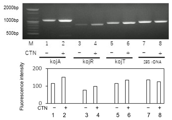 To further investigate the enhancement of KA production by CTN, we examined the expressions of KA biosynthesis genes in fungal mycelia that had been cultured in YES medium or YES medium supplemented with CTN. Although all of the KA biosynthesis genes kojA, kojR, and kojT were expressed in the absence of CTN, the expressions of all three were increased by the addition of CTN (Figure 6). These results suggested that the enhancement of KA production by CTN occurs at a transcription step of KA biosynthesis genes.