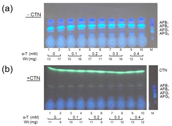 A. parasiticus 48B11 was incubated in YES medium or YES medium supplemented with α-tocopherol concentrations from 0.1 mM to 0.4 mM (Figure 7). The production of AF was inhibited with CTN, and this inhibition was not recovered by the addition of these concentrations of α-tocopherol. This result suggested that ROS stress may not be involved in the inhibitory effect of CTN on the production of AF. In addition, although CTN inhibited the fungal growth of the 48B11 strain to approx. 67% of that without CTN, and the inhibition ratio was not significantly changed by the addition of 0.1–0.3 mM α-tocopherol. Although high concentration (0.4 mM) of α-tocopherol appeared to be different (Figure 7a,b), a more detailed study of the effects of α-tocopherol on AF production and the fungal growth is in progress in our laboratory.