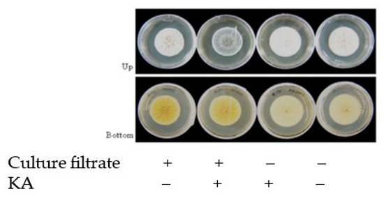 P. citrinum NFRI-MI190 was cultured in a GY agar plate supplemented (10-fold dilution) with the culture filtrate P. citrinum NFRI-190 and/or 100 mM KA for 4 days (Figure 8). KA did not affect the growth of P. citrinum, whereas the addition of KA slightly changed the color of the conidiospores of P. citrinum (Figure 8). This might suggest that P. citrinum is affected by Aspergillus species via the formation of KA.