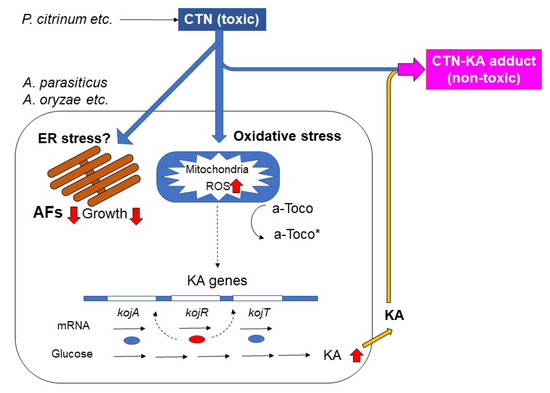 Our results showed that CTN enhanced the production of KA in A. parasiticus as well as A. oryzae and that the enhancement of KA production by CTN was alleviated with α-tocopherol and BHA, which are ROS scavengers (Figure 5). Since CTN has been known to exert a variety of toxic effects on animals and human cells through oxidative stress by the production of ROS mainly in mitochondria [29,30,31,32,33], these results indicate that the ROS production caused by CTN may be involved in the enhancement of KA production. Figure 9 illustrates our postulated reaction mechanism of CTN on KA-producing fungi such as A. parasiticus and A. oryzae. We speculate that the transcription of the KA biosynthesis genes kojA, kojR, and kojT was caused via oxidative stress due to the production of ROS by CTN (Figure 6 and Figure 8). Even in the absence of CTN, a certain amount of KA was produced (Figure 5a–d), suggesting that a small amount of ROS might be endogenously produced. Our present findings also demonstrated that compared to the KA-producing strains, the KA-non-producing mutants or strains were more susceptible to CTN. These results indicate that KA-producing fungi such as A. flavus and A. oryzae may protect themselves from the toxic effect of CTN by a conversion of toxic CTN to the non-toxic CTN-KA adduct with KA, the production of which was further enhanced with CTN (Figure 3 and Figure 4).