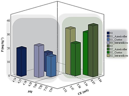 One of the recognized benefits of AMF is their ability to improve plant nutritional status, thereby promoting plant growth and tolerance to stress conditions [10,35]. The restoration of HM-contaminated soils may be due to the greater absorption of these elements in the mycorrhizosphere [35]; it is therefore important to study the impact of AMF inoculation on soil biology and chemical properties. AMF are typically known to improve plant growth and dry weight and to protect against stress caused by metals and metalloids [8] by favoring increased nutrient uptake, especially phosphorus (P), which is involved in plant detoxification mechanisms [7]. In our study, inoculation with AMF showed a decrease in the P concentrations in the soils studied. Aznalcollar was more efficient in capturing P in both soils (S1 and S2) and Custos mainly in the soil with higher stress levels due to HM contamination (S1) and a pH of under 5. This suggests that these AMF assist in the transport of these nutrients to the plant, while favoring its nutritional conditions and consequently its development [37]. This is in line with the studies conducted by [38] whose authors observed that the absorption of phosphorus in tomato plants changed according to the different species of inoculated mycorrhizae.