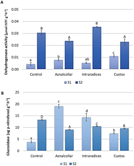 Enzymatic activity measured in soils 1 and 2 (S1 and S2) inoculated with the three AMF selected (Aznalcollar, Intraradices, and Custos): (A) dehydrogenase; (B) ß-glucosidase. Error bars represent one standard deviation from the mean (n = 3). Different letters indicate significant differences between treatments (p < 0.05) according to the Duncan post-hoc test; lowercase for S1 and capital letters for S2.