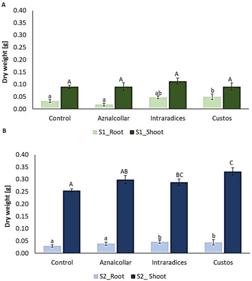 Total biomass of roots and shoots in soil 1 (S1) (A) and soil 2 (S2) (B) inoculated with the three AMF selected (Aznalcollar, Intraradices, and Custos). Error bars represent standard deviation. Different letters indicate significant differences between treatments (p < 0.05) according to the Duncan post-hoc test: lowercase for S1 and capital letters for S2.