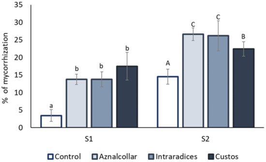 Percentages of root mycorrhization for the three AMF selected (Aznalcollar, Intraradices, and Custos). Values are means (n = 5). Different letters indicate significant differences between treatments (p < 0.05) according to the Duncan post-hoc test: lowercase for soil 1 (S1) and capital letters for soil 2 (S2).