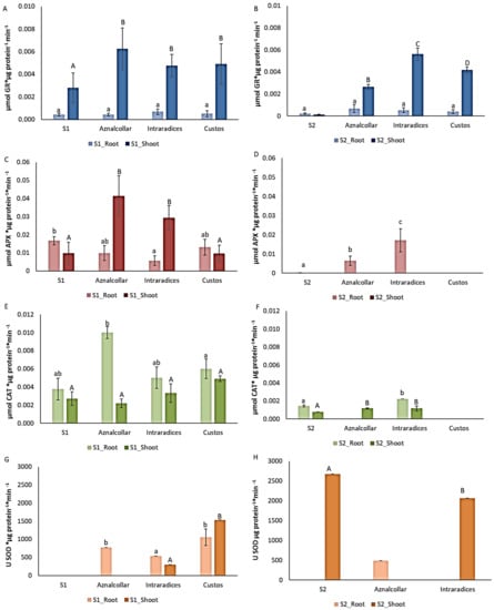 Enzymatic activities GR (A,B), APX (C,D), CAT (E,F) and SOD (G,H) in roots and shoots of control and mycorrhizal plants in soil 1 (S1, left column) and soil 2 (S2, right column). Error bars represent one standard deviation from the mean (n = 3). Different letters indicate significant differences between treatments (p < 0.05) according to Duncan post-hoc test: lowercase for S1 and capital letters for S2.