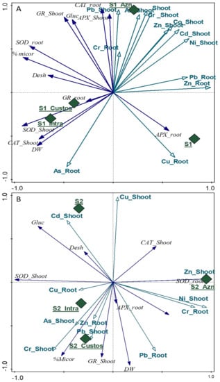 Principal component analysis (PCA) for the analyzed soil 1 (S1) (A) and soil 2 (S2) (B). The treatments used (control: S1 and S2; Aznalcollar: Azn; Intraradices: Intra; Custos: Custos) are correlated with green diamonds; the concentration of heavy metals in roots and shoots with green arrows; and the biological parameters (enzymatic antioxidant systems (APX, GR, CAT, SOD), enzymatic soil activity (Desh and Gluc), plant biomass (DW), and percentage of mycorrhization (%Micor) with dark blue arrows.