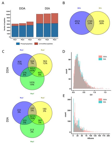 Figure 1. Performance comparison of three M. oryzae biological replicates measured in DDA and DIA regarding (A) peptide counts (B) overlap of identified phosphor-peptides (C) overlap within DDA and DIA replicates (D) precursor quantity reproducibility and (E) phosphosite identification confidence.