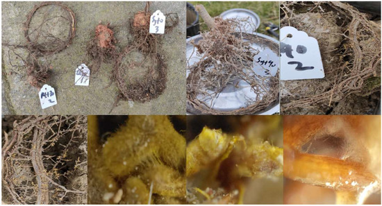 In March 2021, 1200 one-year-old P. massoniana seedlings were randomly selected and grown in a greenhouse, with each seedling planted in a separate pot (20 cm in diameter and 15 cm in height) filled with 3 kg of soil. The soil was collected from the P. massoniana forest stands within 2 km of the experimental site and was sterilized with high-temperature sterilization. The basic physical and chemical properties of the experimental soil were as follows: total soil N was 1.01 g·kg−1, total soil P was 0.54 g·kg−1, total soil K was 1.53 g·kg−1, available soil N was 47.28 mg·kg−1, available soil P was 8.97 mg·kg−1, available soil K was 90.17 mg·kg−1, organic matter content was 13.97 g·kg−1, and pH was 5.97. Three months after inoculation, 30 seedlings were randomly selected from each treatment. The infection rate of EMF was observed with a microscope. It was found that all the plants inoculated with EMF had been infected (Figure 1).