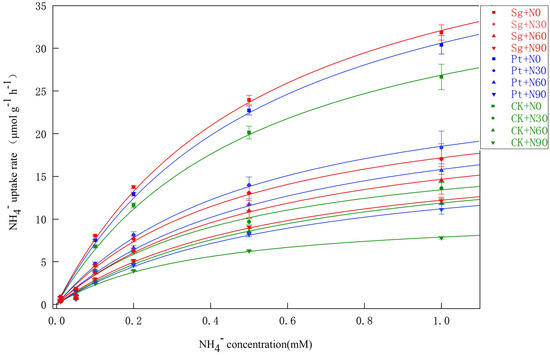 Uptake of NH4+ by Pinus massoniana seedlings as a function of NH4+ solution concentration. Note: Vertical bars illustrate standard errors of the means (n = 3). CK: control. Sg: Suillus grevillei. Pt: Pisolithus tinctorius. N0: 0 kg·N·ha−1a−1. N30: normal deposition of 30 kg·N·ha−1a−1. N60: moderate deposition of 60 kg·N·ha−1a−1. N90: severe deposition of 90 kg·N·ha−1a−1.