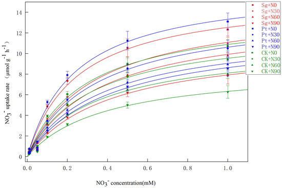Uptake of NO3− by Pinus massoniana seedlings as a function of NO3− solution concentration. Note: Vertical bars illustrate standard errors of the means (n = 3). CK: control. Sg: Suillus grevillei. Pt: Pisolithus tinctorius. N0: 0 kg·N·ha−1a−1. N30: normal deposition of 30 kg·N·ha−1a−1. N60: moderate deposition of 60 kg·N·ha−1a−1. N90: severe deposition of 90 kg·N·ha−1a−1.