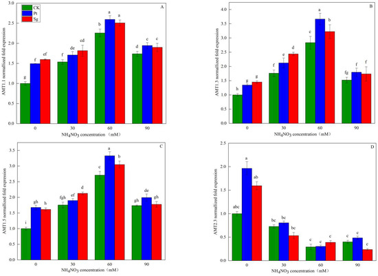 The relative expression of AMT family genes of Pinus massoniana seedlings as a function of NO3− solution concentration (A, B, C and D). Note: Vertical bars illustrate standard errors of means (n = 3). Differences in treatments were analyzed with the Kruskal-Wallis rank sum test. Significant tests (p < 0.05) were followed by Duncan’s test of multiple comparisons, significant differences are indicated by lowercase letters.CK: control. Sg: Suillus grevillei. Pt: Pisolithus tinctorius. N0: 0 kg·N·ha−1a−1. N30: normal deposition of 30 kg·N·ha−1a−1. N60: moderate deposition of 60 kg·N·ha−1a−1. N90: severe deposition of 90 kg·N·ha−1a−1.